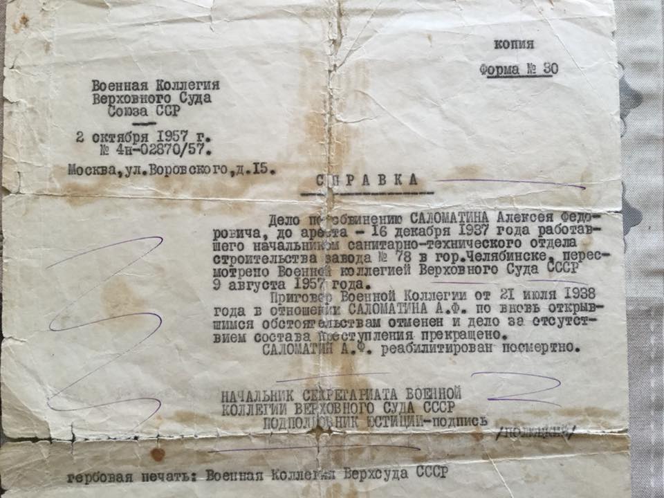 Вот документ эпохи. Справка о решении суда, который пересмотрел дело моего прадеда по «вновь открывшимся обстоятельствам». Что же это были за такие обстоятельства, интересно было бы спросить этих судей? Может, появились новые доказательства, факты, опрошены свидетели, которые позволили суду иначе взглянуть на диверсионную и вредительскую деятельность гр. Соломатина Алексея Федоровича, шпиона на службе японской, английской и американской разведок? Нет, ничего подобного не было. Для отмены приговора и вынесения нового решения имел значение только один факт, случившийся между расстрелом и выдачей этой справки о посмертной реабилитации, только одно «вновь открывшееся обстоятельство». Этот факт состоял в том, что Сталин сдох. Если по этому поводу и можно о чем сожалеть, так только о том, что этого не случилось раньше.